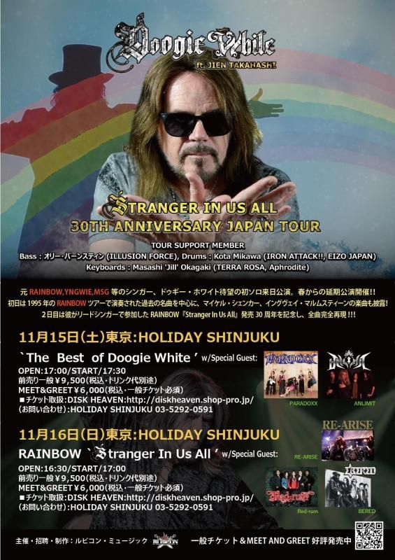 この度、Doogie White並びに其の医師の判断を受け、4月19日 (土) 並びに4月20日 (日) に予定されておりました「STRANGER IN US ALL 30th ANNIVERSARY JAPAN TOUR」を、下記の日程へ延期させて頂く事となりました。… pic.twitter.com/O6QdTRUAKX